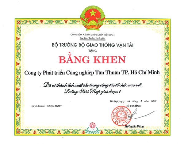 3. Bằng khen của Bộ Giao Thông Vận Tải: "Đã có thành tích xuất sắc trong công tác tổ chức nạo vét luồng Soài Rạp giai đoạn I" (Quyết định số 598/ QĐ-BGTVT ngày 16 tháng 03 năm 2009).
